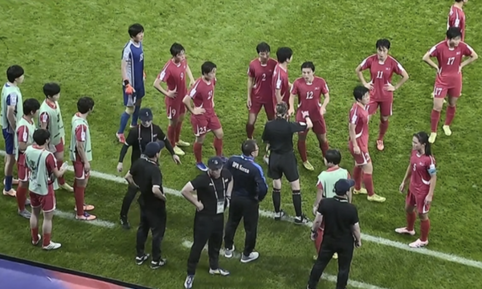 朝鲜队一度考虑罢赛,比赛中断长达近4分钟。裁判无奈了,出示黄牌后直接吹响了半场结束哨声。