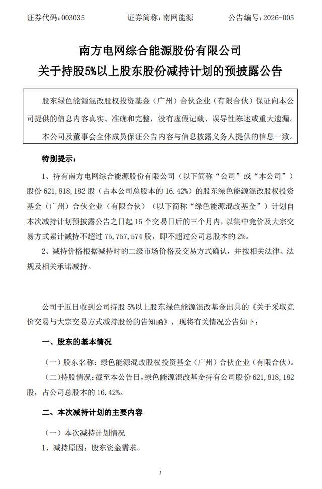 3月16日,南网能源(003035.SZ)发布减持公告,公司持股5%以上股东绿色能源混改股权投资基金(广州)合伙企业(有限合伙)计划减持公司股份。